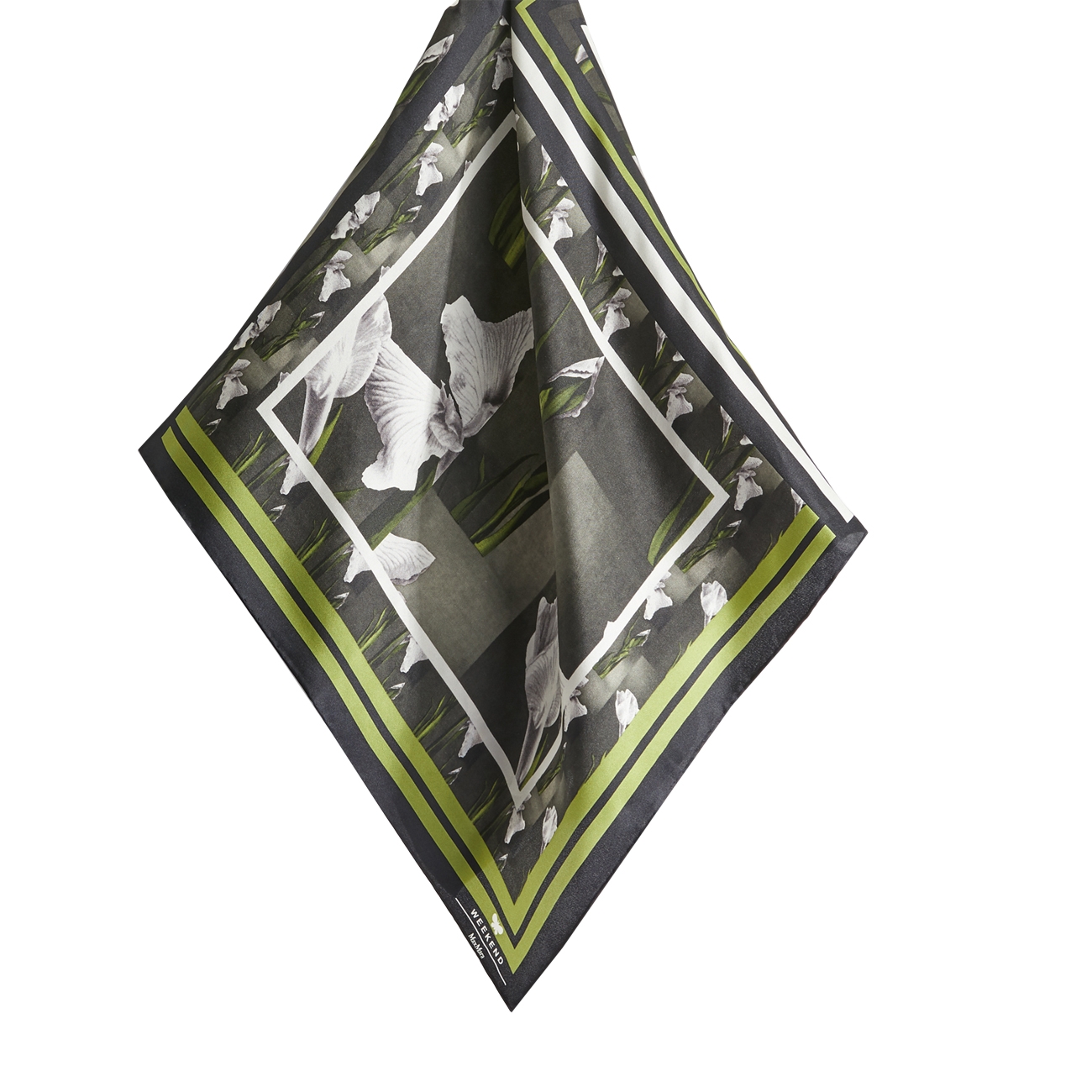 Jaceastă eșarfă este fabricată din fire de mătase cu imprimeuri de colecție. Arată fantastic la gât sau legată în jurul mânerelor geantei tale preferate. Măsurători 90 X 90 cm.