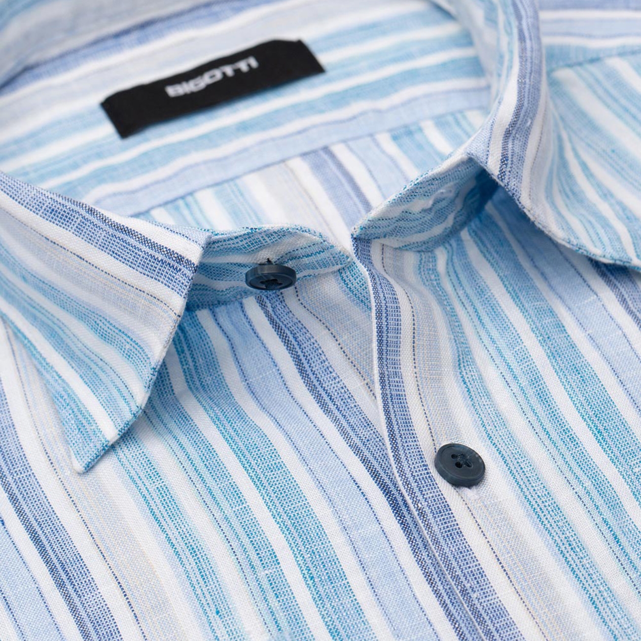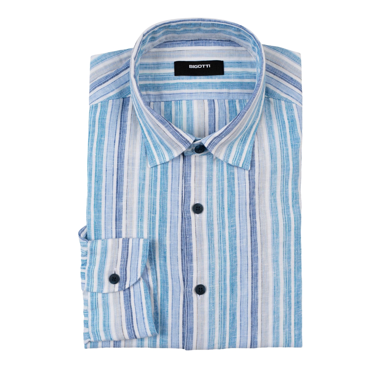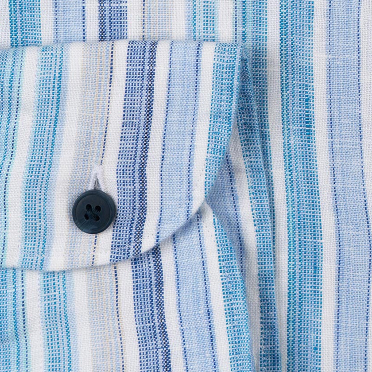 Cămașă casual din 100% in, cu un design în dungi verticale în nuanțe de alb, albastru și bleu, ideală pentru ținutele de vară. Țesătura lejeră și respirabilă oferă confort optim în zilele călduroase, iar croiala clasică cu guler și închidere cu nasturi conferă un look relaxat, dar rafinat.