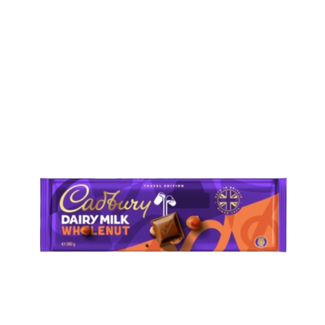 Tableta Cadbury Dairy Milk Whole Nut Travel Edition de 250g combină textura fină a celebrei ciocolate cu lapte Cadbury cu crocantul alunelor întregi, pentru un contrast delicios. Ambalajul modern în nuanțe de mov și portocaliu păstrează prospețimea și savoarea acestei gustări ideale pentru călătorii sau momente speciale.