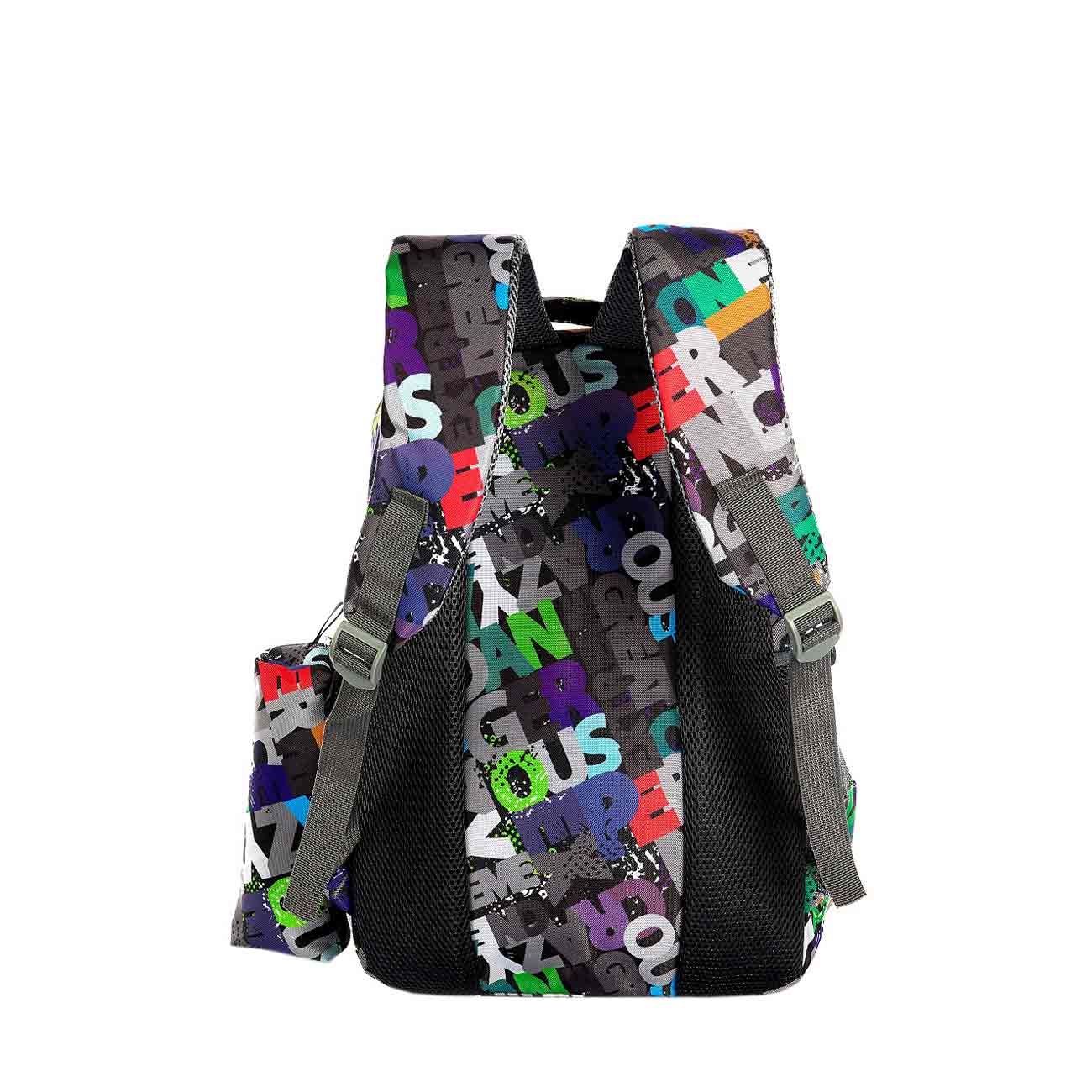 Ghiozdanul Mesco textil prezintă 3 compartimente de dimensiuni diferite, ce au deschidere cu fermoar, 1 buzunar frontal prevazut cu fermoar pe diagonala. 2 buzunare laterale. Partea din spate a acestuia este buretata, bretele late, buretate si ajustabile.