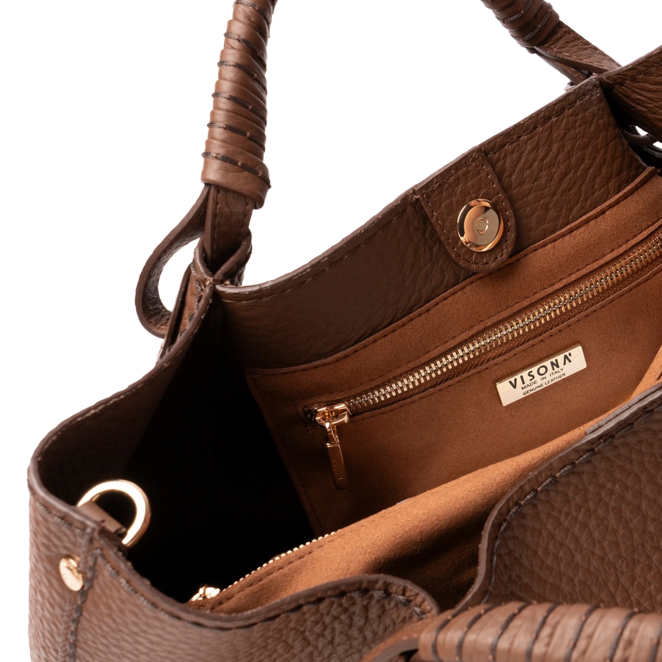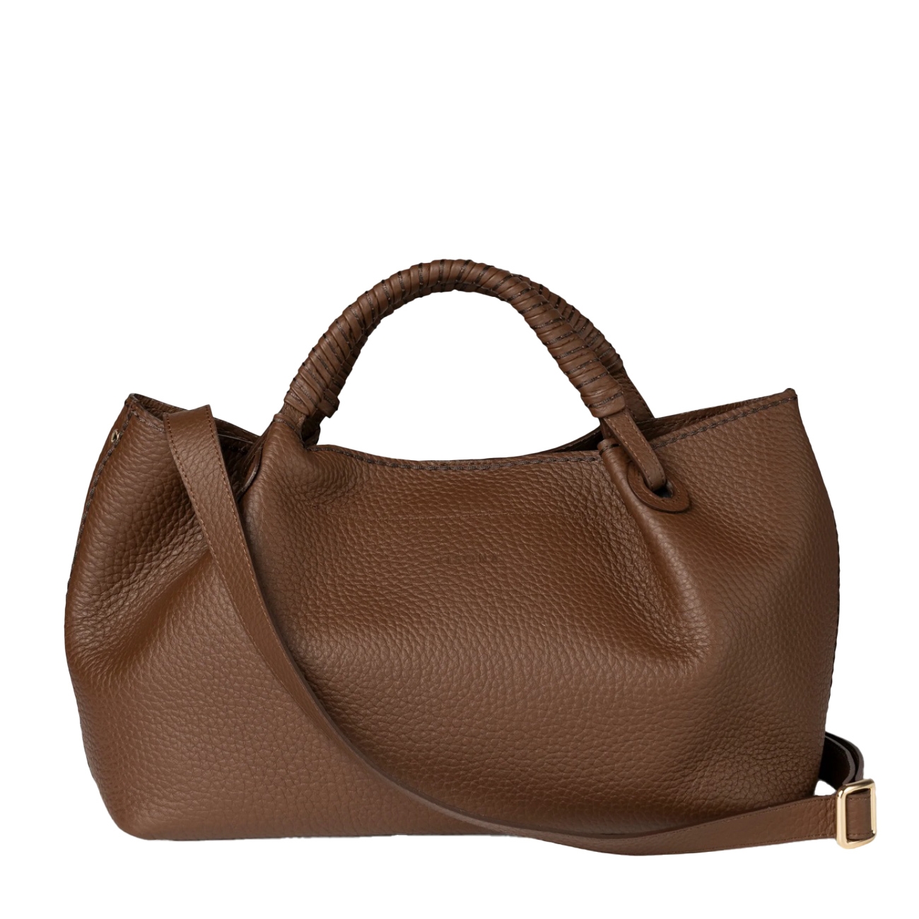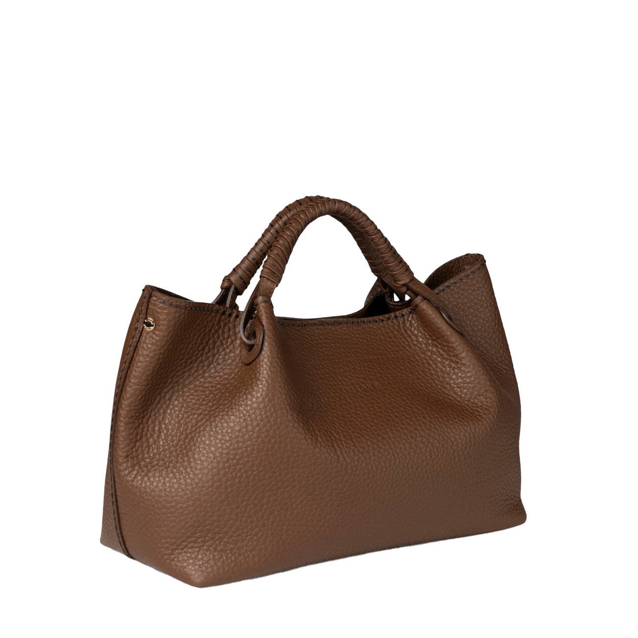 Geanta de damă din piele naturală cu textură embosată este un model elegant și practic, realizat cu atenție la detalii. Este prevăzută cu două mânere scurte împletite manual, ce adaugă un accent rafinat și original. Interiorul spațios include un buzunar cu fermoar pentru organizarea obiectelor esențiale, iar închiderea cu capsă metalică oferă siguranță și acces rapid.
