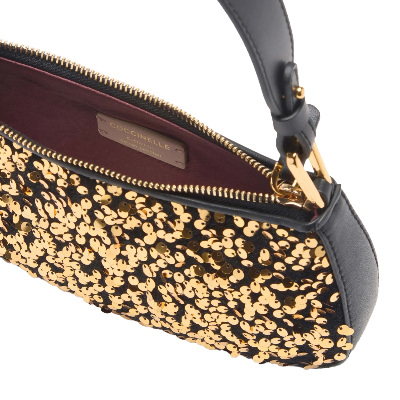 Geanta Merveille Paillettes este accesoriul perfect pentru un look de succes, lăsând o impresie memorabilă datorită designului său elegant și modern. Acoperită cu paiete sclipitoare, geanta adaugă un accent rafinat oricărei ținute, fiind un detaliu glam pentru orice ocazie. Realizată dintr-un mix de materiale premium, cu exterior din 90% piele de vacă și 10% poliester, iar interiorul din bumbac 100%, aceasta îmbină stilul cu durabilitatea.