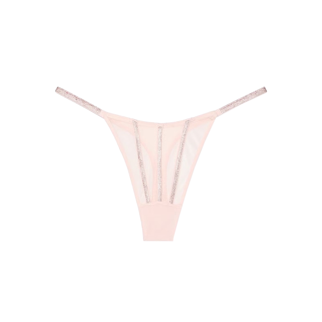 Această pereche de chiloți combină plasă de tul transparentă cu strasuri tonale strălucitoare, creând un look irezistibil de glamour. Croiala cu talie joasă și cordonul reglabil permit o ajustare personalizată. Fără acoperire pe spate, pentru un stil îndrăzneț, și cu un panou de bumbac pentru confort, acest thong oferă atât rafinament, cât și comoditate.
