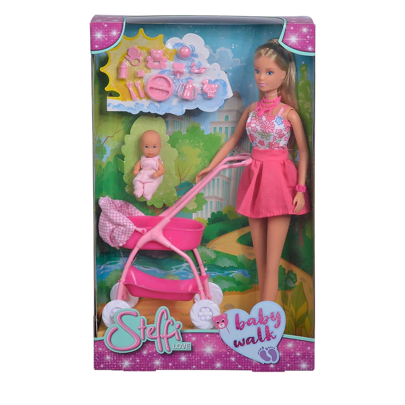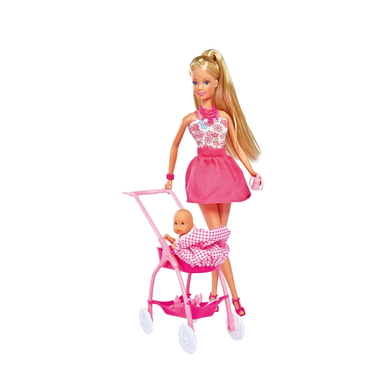 Steffi este o tânără mămică și a ieșit la plimbare cu bebelușul ei drăgălaș. Acest set conține o păpușă Steffi îmbrăcată într-o rochiță roz, un bebeluș, un cărucior și accesorii.