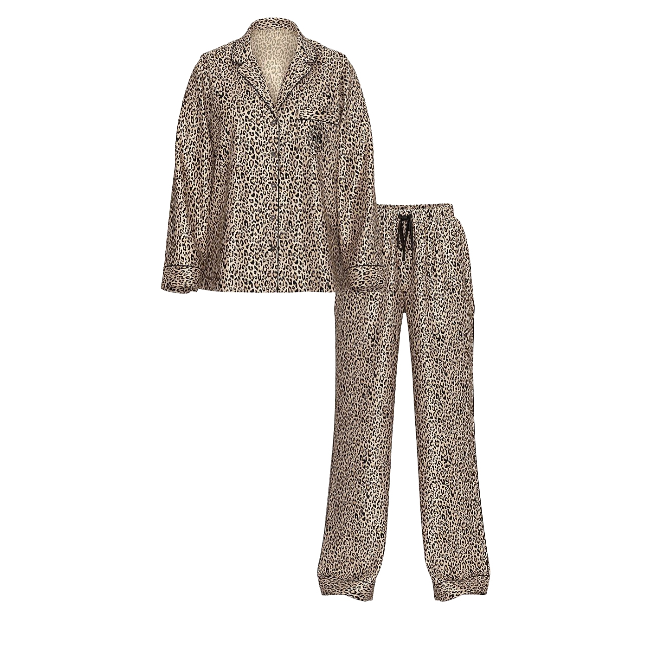 Glazed Satin Long Pajama Set - Marzipan / Leopard