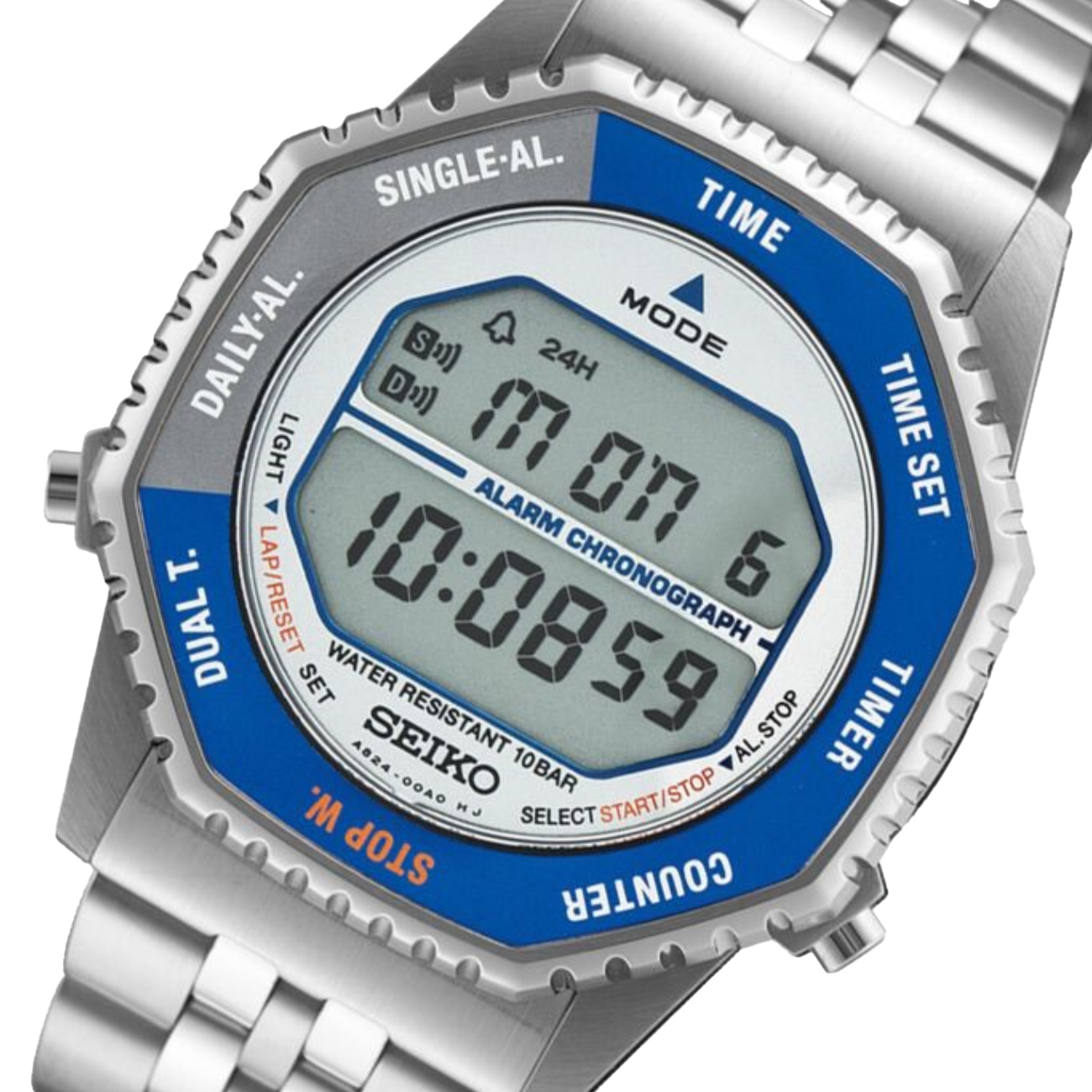 Display-ul digital multifuncțional afișează ora, data și ziua săptămânii, fiind echipat cu cronograf, alarmă dublă, timer și funcție de iluminare. Mecanismul quartz asigură o acuratețe excelentă, iar rezistența la apă de 10 ATM îl face potrivit pentru utilizarea zilnică, inclusiv în timpul activităților acvatice ușoare.