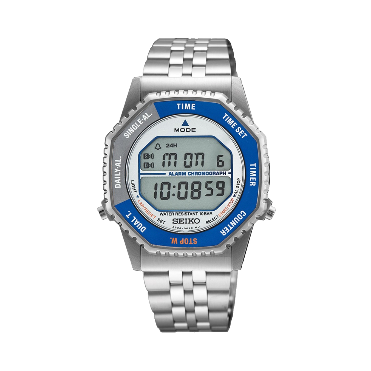 Ceasul Seiko Digital Chronograph SMGG21P1 îmbină stilul retro al anilor ’80 cu funcționalitatea modernă a unui instrument digital de înaltă precizie. Carcasa și brățara din oțel inoxidabil oferă durabilitate și un aspect clasic, iar rama albastră adaugă un accent sportiv distinct.