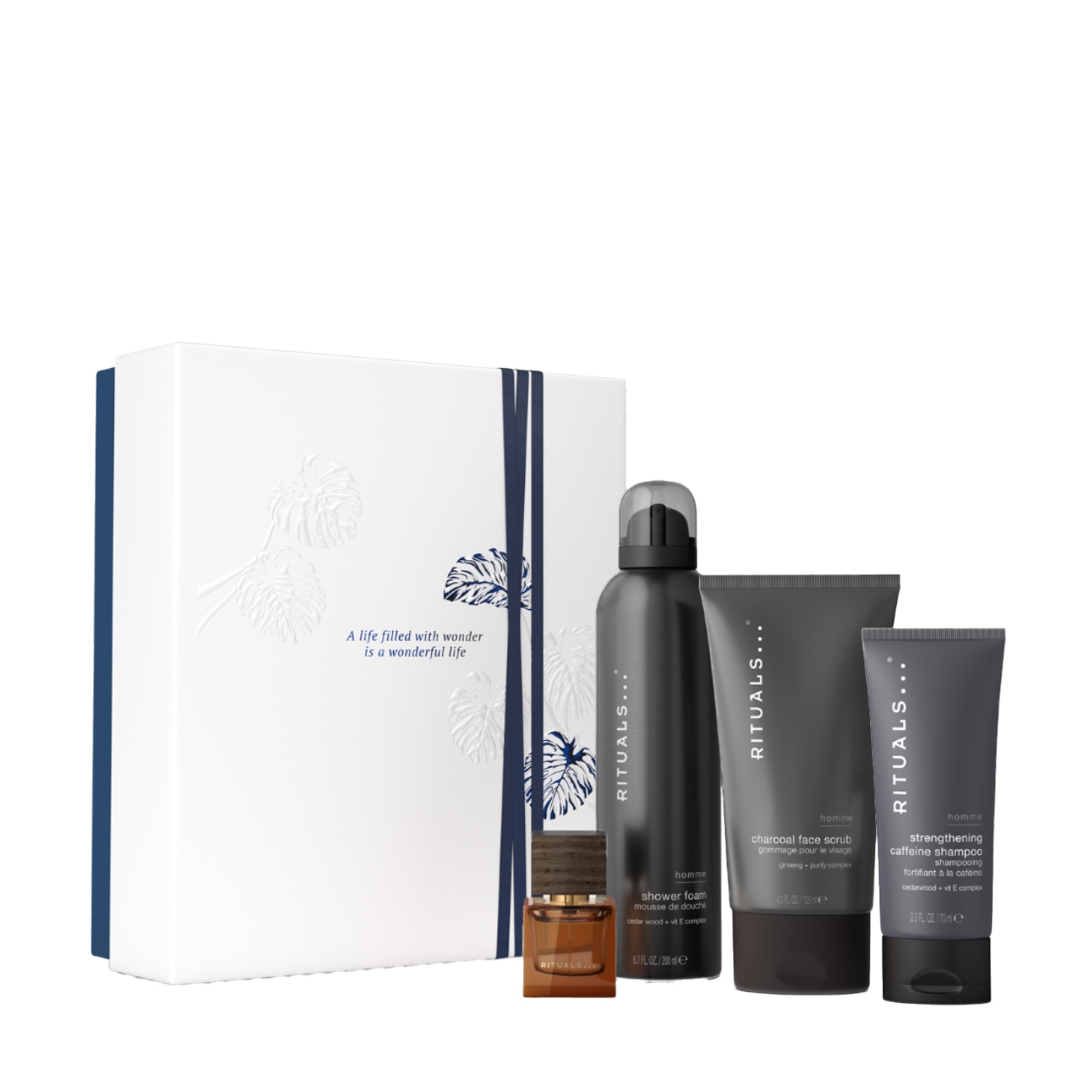 Rituals Travel Exclusive Set – un kit complet de îngrijire, ideal pentru călătorii. Conține spumă de duș revigorantă, exfoliant facial cu cărbune activ, șampon fortifiant cu cofeină și parfum mini, toate prezentate într-o cutie elegantă. Perfect pentru răsfățul personal sau pentru a fi oferit cadou.