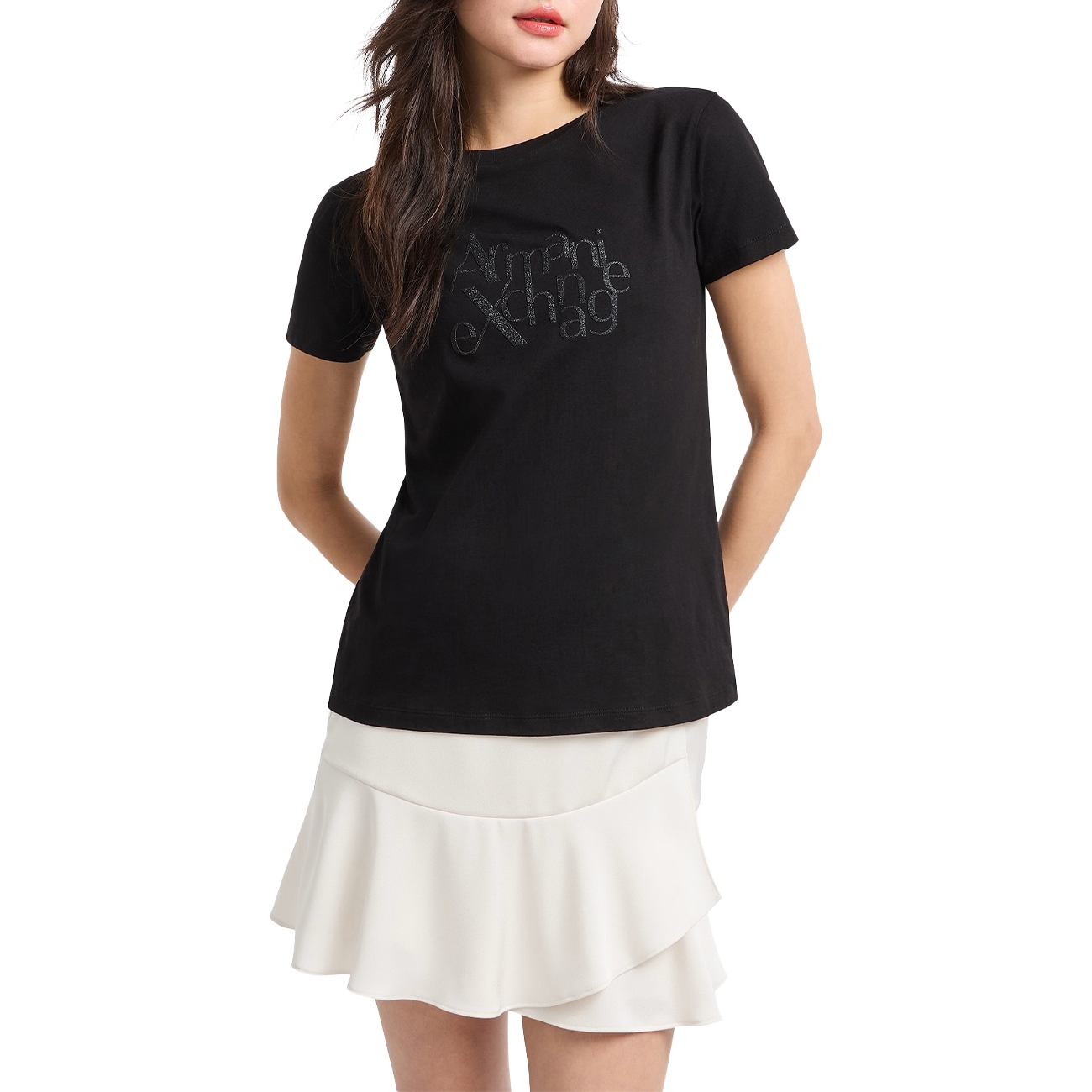 Acest tricou Armani Exchange îmbină confortul cu un stil jucăuș și modern. Realizat din 100% bumbac, oferă o textură moale și respirabilă, ideală pentru purtare zilnică. Designul minimalist este înnobilat de un imprimeu logo supradimensionat cu efect glitter în nuanțe discrete de argintiu, oferind o notă sofisticată și urbană în același timp.