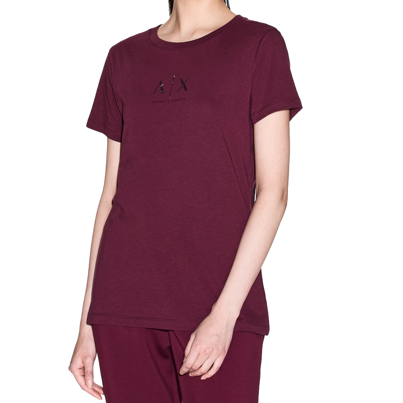 Tricou din bumbac moale, cu croială lejeră și design minimalist, ideal pentru ținutele casual. Modelul se distinge prin logo-ul A|X aplicat frontal cu detalii subtile strălucitoare, ce adaugă o notă rafinată. Gulerul rotund și mânecile scurte completează stilul clasic al acestui tricou, oferind confort și versatilitate.