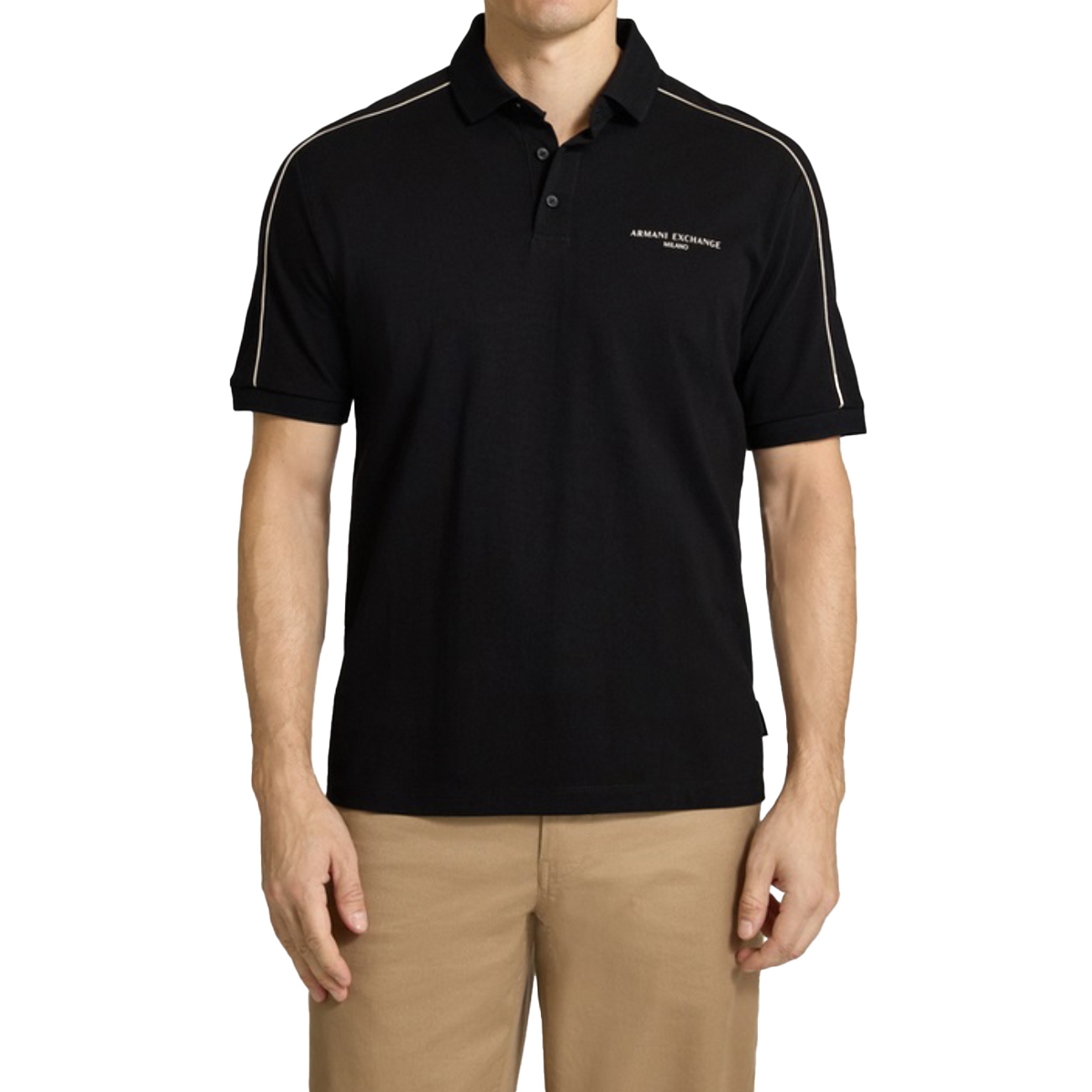 Tricou Armani Exchange pentru bărbați, confecționat din bumbac de calitate, cu croială clasică și guler cu nasturi. Modelul se remarcă prin liniile fine contrastante de pe umeri și mâneci, care adaugă o notă modernă și sportivă. Logo-ul Armani Exchange Milano este discret aplicat pe piept, oferind un detaliu elegant și autentic. Acest tricou este o piesă versatilă, perfectă atât pentru ținute casual, cât și pentru combinații smart-casual.