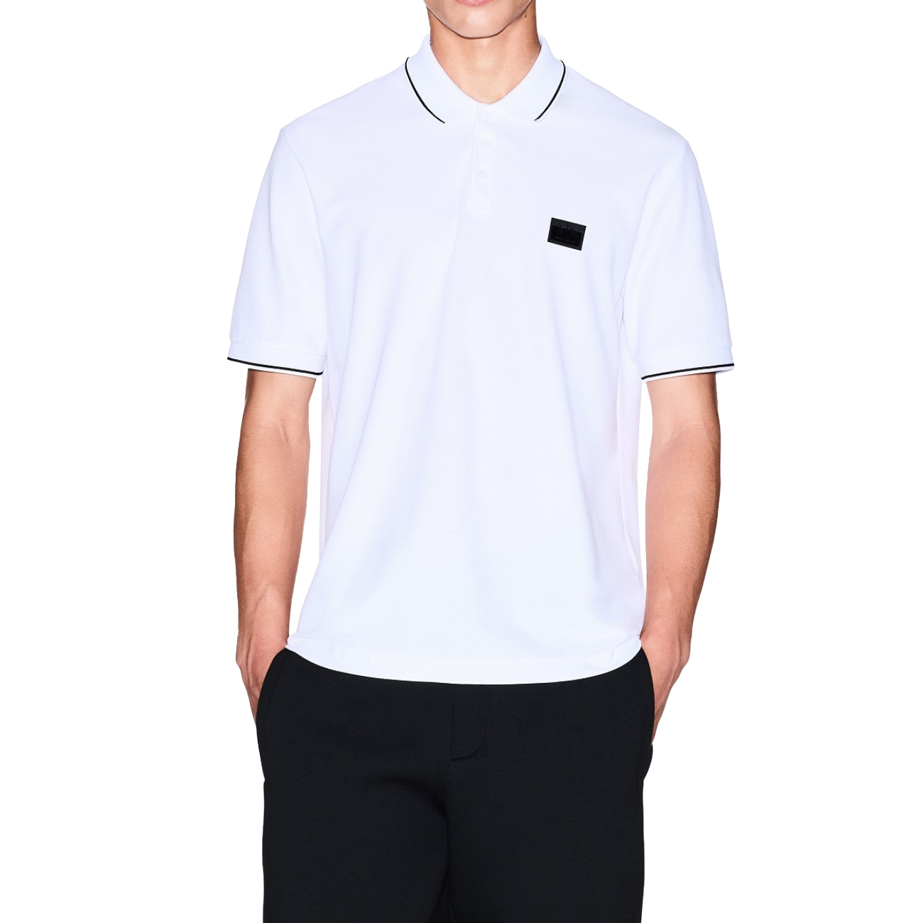 Tricou clasic Armani Exchange, confecționat din bumbac moale și plăcut la atingere, cu un design minimalist și linii curate. Este definit de gulerul cu nasturi și tivurile mânecilor conturate cu dungi subțiri în contrast, ce adaugă o notă rafinată. Logo-ul A|X aplicat pe piept completează stilul modern și elegant.