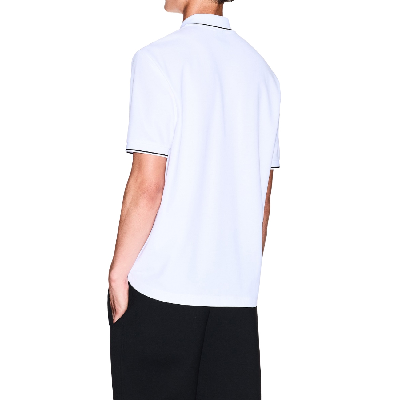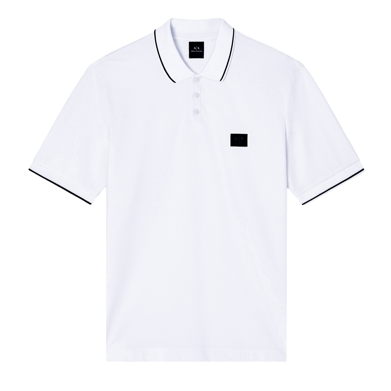 Tricou clasic Armani Exchange, confecționat din bumbac moale și plăcut la atingere, cu un design minimalist și linii curate. Este definit de gulerul cu nasturi și tivurile mânecilor conturate cu dungi subțiri în contrast, ce adaugă o notă rafinată. Logo-ul A|X aplicat pe piept completează stilul modern și elegant.