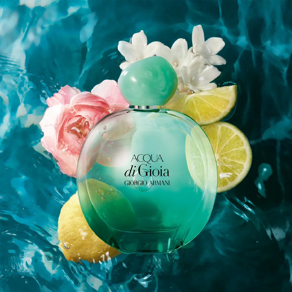 Colectia Acqua di Gioia este o oda adusa naturii si feminitatii autentice. Inspirata de forta apei si energia pamantului, aceasta linie semnata Giorgio Armani celebreaza libertatea si vitalitatea vietii. Este dedicata femeii moderne, senine si increzatoare, care isi gaseste echilibrul intre prospetime, emotie si rafinament. Versiunile Eau de Parfum si Intense ofera interpretari complementare ale aceleiasi esente: luminoasa, eleganta si irezistibila. Lansata in 2010, colectia a devenit rapid un simbol al prospetimii naturale si al elegantei italiene. Inspiratia sa provine din peisajele Mediteranei – valurile linistite, aerul sarat si lumina soarelui reflectata pe apa. Acqua di Gioia surprinde bucuria vietii simple, dar pline de frumusete, fiind creata pentru femeia care radiaza optimism si autenticitate. Designul sticlei, rotunjit si transparent, evoca o picatura de apa pura – o invitatie la armonie si liniste interioara.