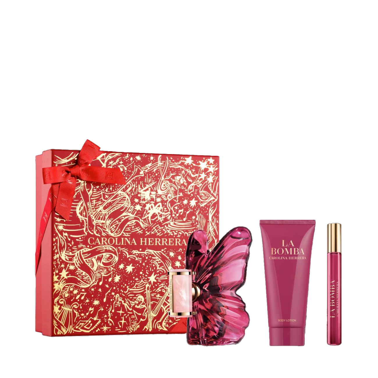 Setul cadou Carolina Herrera La Bomba reunește apa de parfum, loțiunea de corp și varianta practică de voiaj, toate prezentate într-o cutie festivă elegantă. Aroma are un caracter oriental și floral, deschizându-se cu prospețimea exotică a fructului pitahaya, continuând cu delicatețea bujorului roșu și încheindu-se cu dulceața caldă a vaniliei, oferind o semnătură feminină senzuală și radiantă.